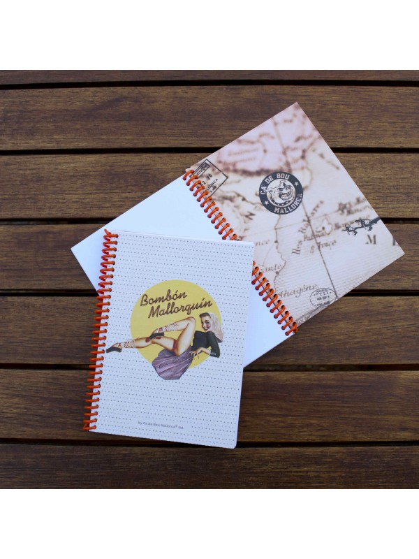 Llibreta de tapa semidura enquadernada en espiral de plàstic taronja -Perfecta per obrir i tancar moltes vegades-. Amb disseny exclusiu de Ca de Bou a la portada i interior. Mida A5 (21 x 15 cm) de 80 pàgines de paper blanques de 120 grams.