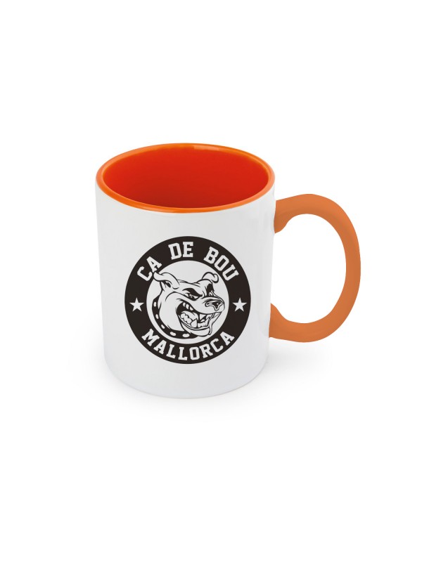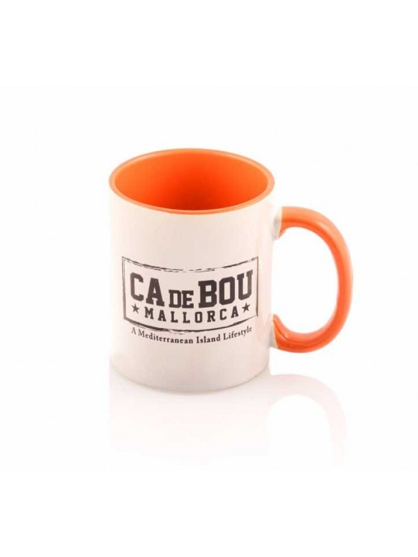 Tassa de ceràmica de color blanc a l'exterior i de color taronja en el seu mànec i interior. Disseny exclusiu i logo de Ca de Bou.